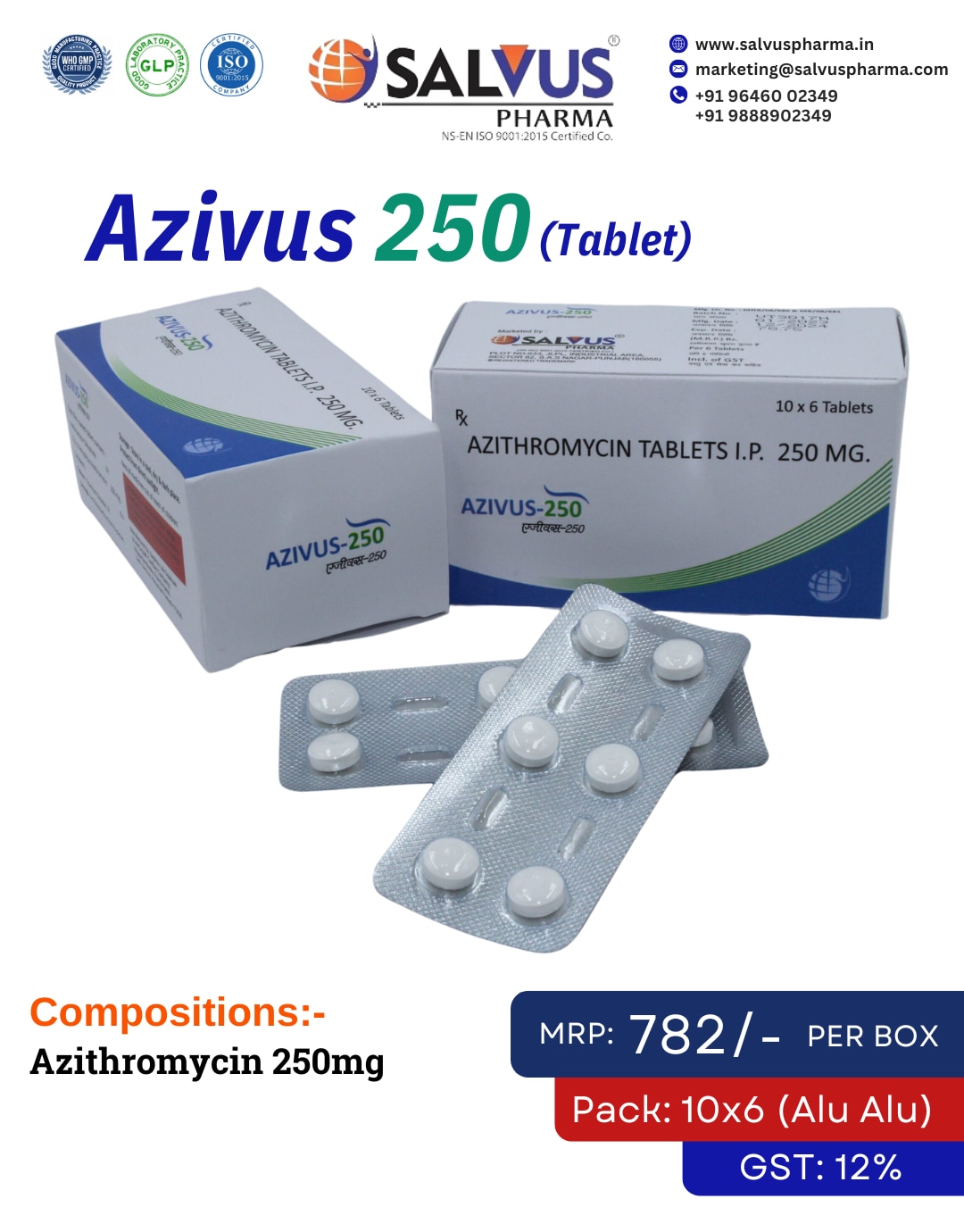 Leading Manufacturer & Supplier of Azithromycin 250mg Tablets Salvus Pharma is a distinguished manufacturer and supplier of Azithromycin 250mg Tablets, expertly formulated and marketed under the brand name Azivus 250. As a premier, ISO, WHO-GMP, and GLP certified pharmaceutical company, we are committed to delivering superior quality antibacterial solutions to combat a wide range of infections. Our dedication to excellence ensures that every batch of Azivus 250 is manufactured in our advanced facilities, adhering to the highest standards of safety, purity, and efficacy. As a leading antibiotics pcd company, we provide outstanding PCD Pharma franchise opportunities throughout India. We equip our franchise partners with a diverse portfolio of in-demand medications, exclusive monopoly rights for their territory, comprehensive marketing materials, and an unwavering, timely supply chain. Choosing Salvus Pharma for your pharma franchise for antibiotic range, including the widely prescribed Azithromycin 250mg tablets, is a strategic step towards a thriving and profitable business with a top-tier antibiotics pcd company. Benefits & Uses of Azithromycin 250mg (Azivus 250) Azithromycin 250mg is a potent macrolide antibiotic highly effective against various bacterial infections. It works by inhibiting bacterial protein synthesis, thereby stopping the growth of bacteria and clearing the infection. Healthcare professionals prescribe Azivus 250 for the treatment of: Respiratory Tract Infections: Including community-acquired pneumonia, bronchitis, sinusitis, and pharyngitis/tonsillitis. Skin and Soft Tissue Infections: Effective against uncomplicated skin infections caused by susceptible bacteria. Sexually Transmitted Infections (STIs): Used for uncomplicated genital infections due to Chlamydia trachomatis or Neisseria gonorrhoeae. Ear Infections: Such as acute otitis media, particularly in children. Mycobacterial Infections: Used in the prevention and treatment of infections caused by Mycobacterium avium complex (MAC). How to Use Take Azivus 250 (Azithromycin 250mg) exactly as prescribed by your healthcare provider. The tablet can be taken with or without food. However, taking it with food may help reduce stomach upset. Swallow the tablet whole with a full glass of water. Do not crush or chew it. It is crucial to complete the full course of antibiotics, even if you begin to feel better after a few days. Stopping the medication prematurely can lead to the infection returning and may contribute to antibiotic resistance. Side Effects While Azivus 250 is generally safe, some individuals may experience side effects. Most are mild and resolve as your body adjusts to the medication. Common Side Effects: Nausea or vomiting Diarrhea Abdominal pain or cramping Headache Dizziness Serious Side Effects (Contact your doctor immediately): Severe or persistent diarrhea (which may be a sign of a new infection). Signs of liver problems (e.g., persistent nausea/vomiting, yellowing eyes/skin, dark urine). Fast or irregular heartbeat. Severe allergic reactions (rash, itching/swelling, severe dizziness, trouble breathing). Precautions Before taking Azivus 250, inform your doctor of your complete medical history. Allergies: Do not take this medicine if you have a known allergy to Azithromycin, or other macrolide antibiotics like erythromycin or clarithromycin. Liver or Kidney Disease: Use with caution. Inform your doctor if you have a history of liver or kidney problems. Heart Conditions: Let your doctor know if you have a history of heart rhythm problems (like QT prolongation). Myasthenia Gravis: This medication may worsen the symptoms of myasthenia gravis. Pregnancy & Breastfeeding: Consult your doctor before using this medication if you are pregnant, planning to become pregnant, or are breastfeeding. Drug Interactions: Azithromycin can interact with other drugs, especially antacids containing aluminum or magnesium, and blood thinners like warfarin. Provide your doctor with a list of all medications you are taking.