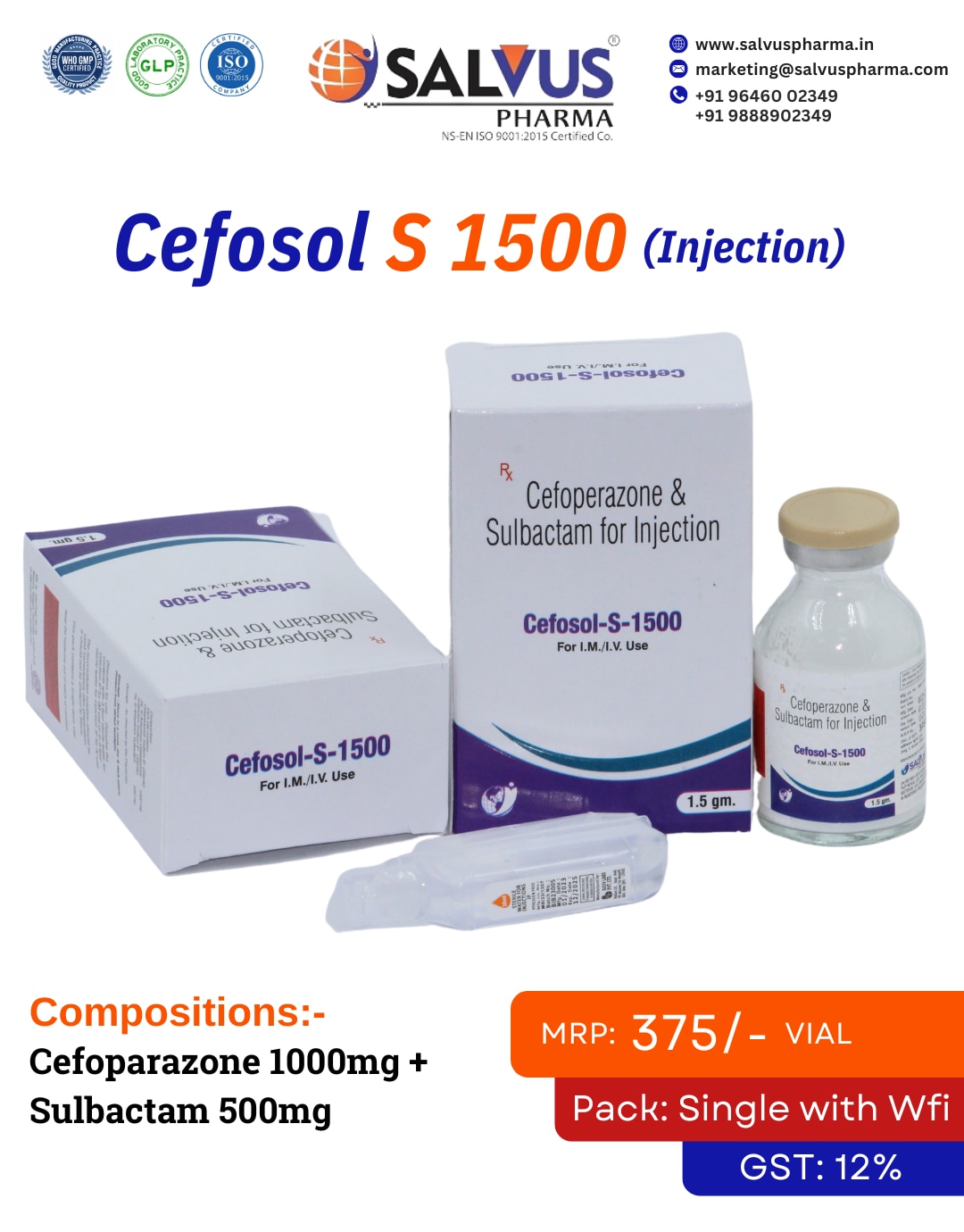 Top PCD Pharma Franchise for Cefoperazone & Sulbactam for Injection Are you looking to partner with a leading PCD Pharma company for a high-demand injectable antibiotic range? Your search ends here. Salvus Pharma, a premier WHO-GMP certified pharmaceutical manufacturer, presents a lucrative PCD Pharma franchise opportunity for our powerful broad-spectrum antibiotic, Cefoperazone 1000mg & Sulbactam 500mg for Injection, marketed as Cefosol-S 1500. This critical care product, supplied with WFI (Water for Injection), is a vital offering in the hospital and clinical sector, promising substantial growth for our franchise partners. Why Franchise in the Cefoperazone & Sulbactam Market with Salvus Pharma? A partnership with Salvus Pharma positions you for success in the competitive pharmaceutical landscape. We provide unparalleled support to our franchise associates. Premium Quality Injectable: Our Cefoperazone & Sulbactam for Injection (Cefosol-S 1500) is produced in our state-of-the-art, certified manufacturing plants. This guarantees a sterile, effective, and reliable product that meets the stringent standards of critical care. Exclusive Monopoly-Based Franchise: We offer exclusive marketing and distribution rights for your designated territory. This monopoly model protects you from internal competition, allowing you to become the primary supplier and maximize your market potential. Targeted Marketing & Scientific Support: We provide our partners with in-depth training and high-quality promotional materials that highlight the clinical advantages of the Cefoperazone & Sulbactam combination, helping you build strong relationships with hospitals, clinics, and key medical practitioners. Consistent & Reliable Supply: Our efficient logistics and inventory management ensure a steady and uninterrupted supply of our injectable antibiotic range, empowering you to meet the urgent demands of the healthcare sector.