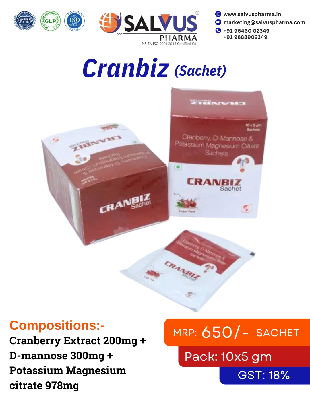 Leading Manufacturer & Supplier of Urological Support Sachets Salvus Pharma is a trusted manufacturer and supplier of Cranberry Extract, D-Mannose & Potassium Magnesium Citrate Sachets, a scientifically formulated product for urinary tract health, marketed under the brand name Cranbiz. As a leading ISO, WHO-GMP, and GLP certified pharmaceutical company, we are committed to delivering innovative and effective solutions for urological care. The quality of Cranbiz is guaranteed, with each sachet produced in our advanced, certified manufacturing facilities to ensure maximum efficacy and safety. As a top-tier PCD Pharma company for uro care products, we offer exceptional PCD Pharma franchise opportunities across India. We provide our franchise partners with a specialized portfolio of high-demand urological products, full monopoly rights, strategic marketing support, and an efficient supply chain. Choosing Salvus Pharma for our uro care range, featuring specialized products like Cranbiz sachet, is a strategic decision for building a successful and profitable pharmaceutical business.
