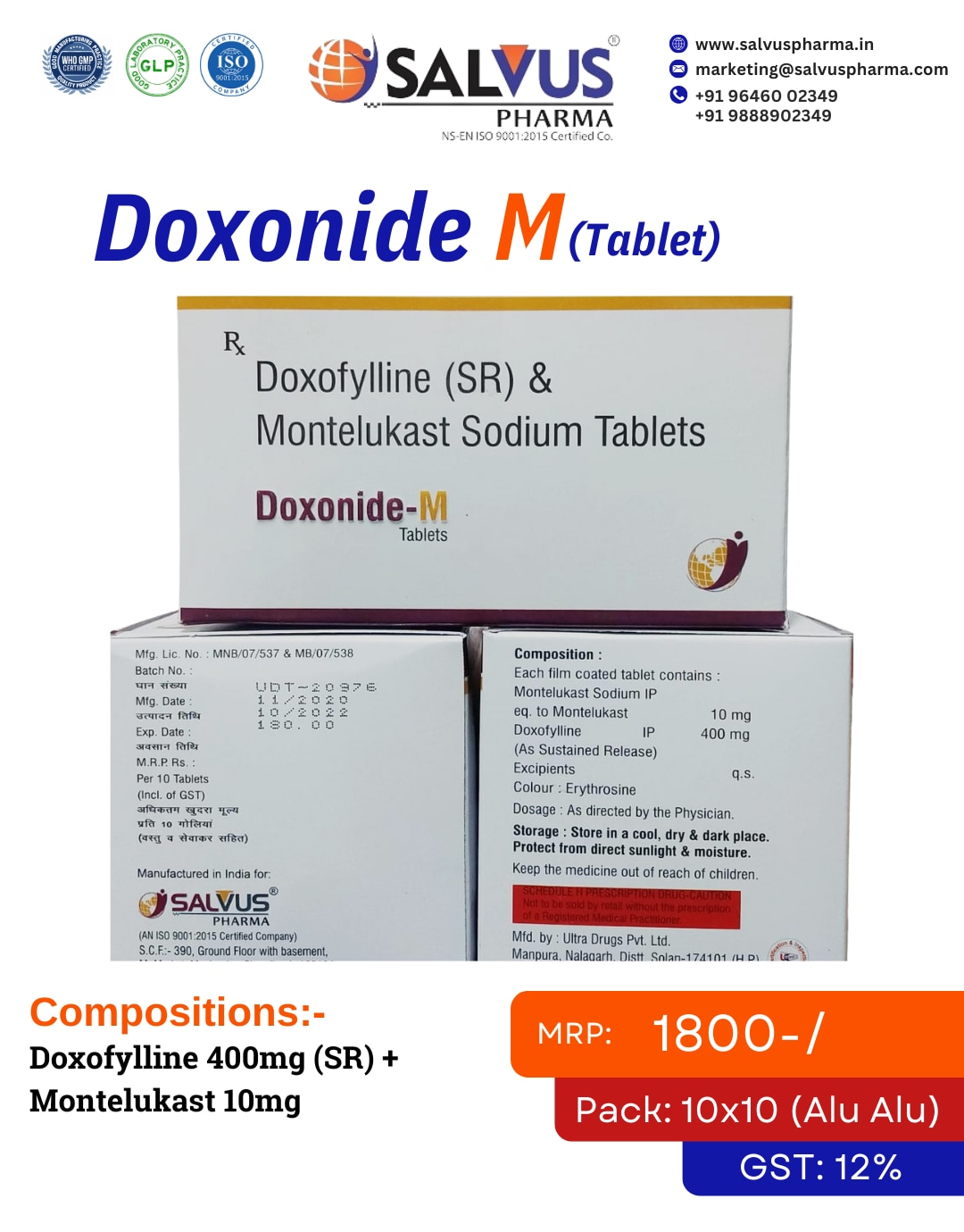 Leading Manufacturer & Supplier of Advanced Respiratory Tablets Salvus Pharma is a distinguished manufacturer and supplier of Doxofylline (SR) 400mg & Montelukast 10mg Tablets, an advanced combination for managing chronic respiratory diseases, marketed under the brand name Doxonide M. As a premier ISO, WHO-GMP, and GLP certified pharmaceutical company, we are dedicated to advancing respiratory care with innovative and effective solutions. The superior quality of Doxonide M is guaranteed, as it is produced in our state-of-the-art manufacturing facilities that adhere to the strictest international standards. As a top-tier PCD Pharma company for respiratory and anti-allergic range, we offer exceptional PCD Pharma franchise opportunities across India. We provide our franchise partners with a comprehensive portfolio of high-demand products, exclusive monopoly rights, robust marketing support, and a seamless supply chain. Partnering with Salvus Pharma for our specialized respiratory products, including the essential Doxonide M tablets, is a strategic choice for building a successful and profitable business. Benefits & Uses of Doxonide M Doxonide M combines two powerful medicines to provide comprehensive control over asthma and COPD symptoms by reducing bronchoconstriction and inflammation. Doxofylline (Sustained Release 400mg): A modern bronchodilator that relaxes the airway muscles, making breathing easier. The sustained-release formula ensures consistent, round-the-clock therapeutic effect with a better safety profile than older drugs. Montelukast (10mg): A leukotriene receptor antagonist that blocks substances called leukotrienes. This action helps to reduce inflammation and swelling in the airways and control allergy symptoms. Healthcare professionals prescribe Doxonide M for the long-term management of: Asthma: As a maintenance therapy to prevent wheezing, shortness of breath, and asthma attacks. Chronic Obstructive Pulmonary Disease (COPD): To improve breathing and reduce flare-ups. Allergic Rhinitis associated with Asthma: Helps control sneezing and runny nose in patients who also suffer from asthma. How to Use Take Doxonide M exactly as directed by your physician. It is not intended for the relief of acute asthma attacks. Swallow the tablet whole with a sufficient amount of water. Do not crush, chew, or break it. It is best to take this medication in the evening, with or without food, or as advised by your doctor. For the best results, take it at the same time every day. Side Effects While Doxonide M is generally well-tolerated, some individuals may experience side effects. Common Side Effects: Headache Nausea or vomiting Stomach pain or upset Insomnia (difficulty sleeping) Upper respiratory tract infection Serious Side Effects (Contact your doctor immediately): Severe allergic reactions (rash, itching, swelling of the face, lips, or tongue). Mood or behavior changes (such as agitation, anxiety, depression, or suicidal thoughts). Irregular or fast heartbeat. Precautions Before starting your treatment with Doxonide M, it is crucial to inform your doctor of your complete medical history. Allergies: Do not take this medication if you are allergic to Doxofylline, Montelukast, or any other ingredients. Acute Asthma Attacks: This medicine is for prevention and should not be used to treat a sudden asthma attack. Liver Disease: Inform your doctor if you have a history of liver problems, as dose adjustments may be required. Heart Conditions: Use with caution if you suffer from cardiovascular issues like high blood pressure or heart failure. Pregnancy & Breastfeeding: Consult your doctor before using this medication if you are pregnant, planning a pregnancy, or are breastfeeding. Drug Interactions: Inform your doctor about all other medicines you are taking, as Doxonide M can interact with drugs like erythromycin, cimetidine, phenobarbital, and rifampin.