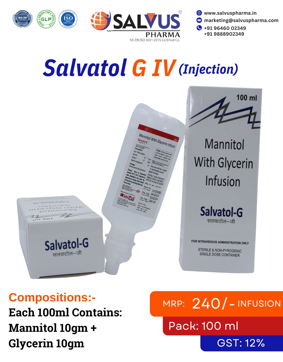 PCD Pharma Franchise for Mannitol & Glycerin Infusion Tap into the critical care market with a high-demand osmotic diuretic. Salvus Pharma, a premier WHO-GMP and ISO certified pharmaceutical company, is offering an exceptional PCD Pharma franchise opportunity for our Mannitol with Glycerin Infusion (10g/10g per 100ml). Marketed as Salvatol-G IV, this intravenous infusion is indispensable in neurocritical care and ophthalmology for managing elevated intracranial and intraocular pressure, presenting a lucrative opportunity for our franchise partners. Your Advantage with a Mannitol & Glycerin Infusion Franchise Partnering with Salvus Pharma guarantees a competitive edge in the pharmaceutical market. Superior Quality Assurance: Our Mannitol & Glycerin Infusion is manufactured in a state-of-the-art, sterile facility. Each 100ml single-dose container is non-pyrogenic and meets the highest standards of safety and efficacy. Exclusive Monopoly-Based Franchise: We empower our partners with exclusive monopoly rights for their territory, ensuring you can build your business without internal competition and become the primary supplier for this essential critical care product. Targeted Marketing & Scientific Support: We provide in-depth marketing materials that explain the clinical benefits of combining Mannitol and Glycerin, helping you engage effectively with neurologists, intensivists, and hospital pharmacies. Consistent Product Availability: Our robust production and supply chain management ensure that you have a reliable and uninterrupted supply of Salvatol-G IV, enabling you to meet the urgent demands of critical care settings.