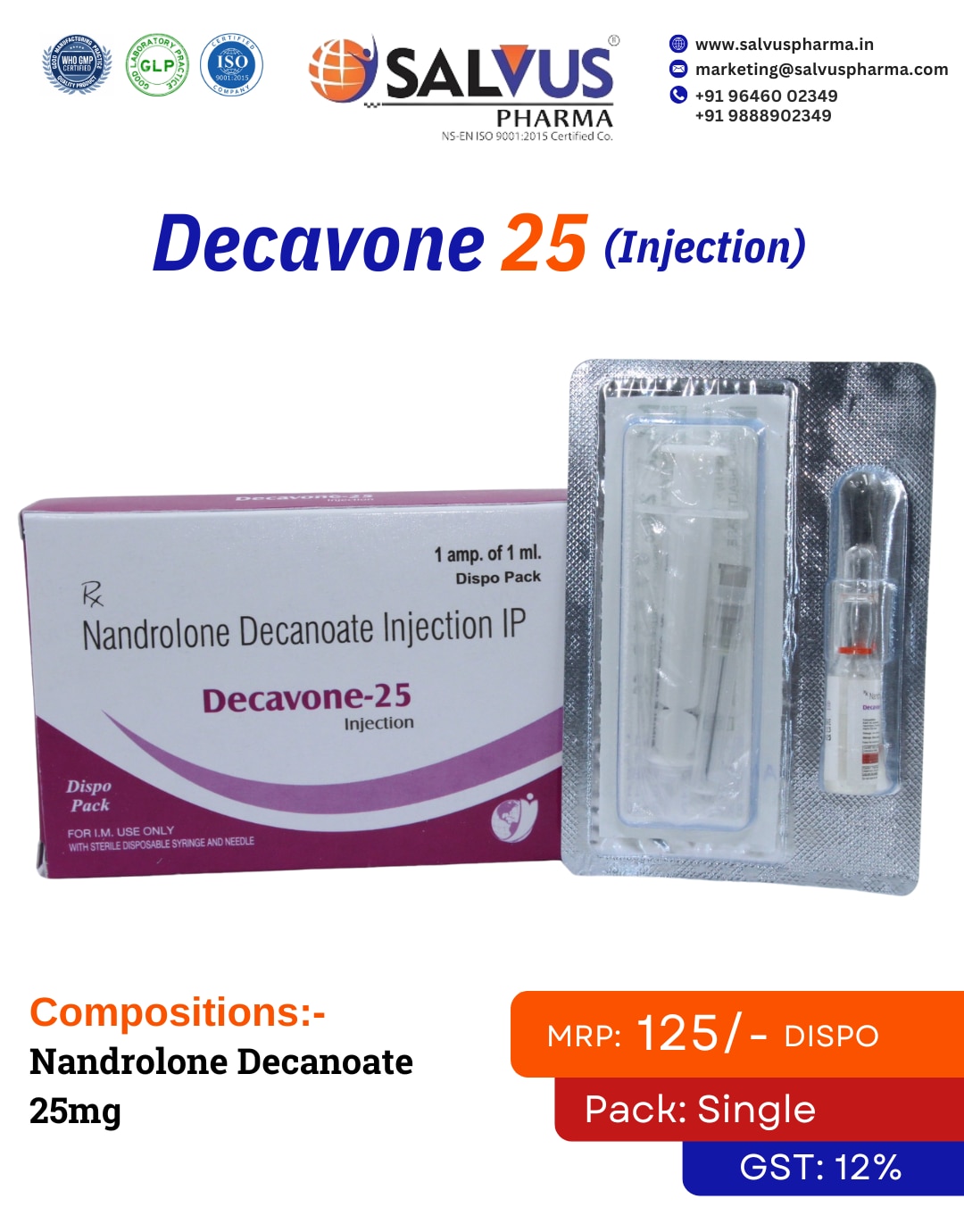 Leading PCD Pharma Franchise for Nandrolone Decanoate Injection Are you ready to tap into the high-potential anabolic steroid and hormone therapy market? Salvus Pharma, an esteemed WHO-GMP certified pharmaceutical leader, is offering an exclusive PCD Pharma franchise for our premium Nandrolone Decanoate Injection I.P. 25mg, presented under the brand name Decavone-25. This specialty injectable, available in a convenient dispo pack, is a sought-after product for managing specific medical conditions, presenting a unique and profitable business venture for our franchise partners. Why Choose a Nandrolone Decanoate Franchise with Salvus Pharma? Partnering with Salvus Pharma for our specialty injectable range ensures you receive the best support and a high-quality product portfolio. Exceptional Quality and Purity: Our Nandrolone Decanoate Injection (Decavone-25) is manufactured in compliance with the highest pharmaceutical standards, guaranteeing a product that is pure, safe, and effective for therapeutic use. Monopoly Rights for Your Territory: We provide our franchise partners with exclusive monopoly-based distribution rights. This strategic advantage allows you to become the sole distributor in your area, maximizing your market share and profitability. Expert Marketing & Educational Support: We supply comprehensive marketing materials and educational resources that detail the clinical applications and benefits of Nandrolone Decanoate, empowering you to have informed discussions with healthcare professionals. Consistent Product Availability: We maintain a robust inventory and an efficient supply chain to ensure you always have access to our products, allowing you to reliably serve your network of clinics and hospitals.