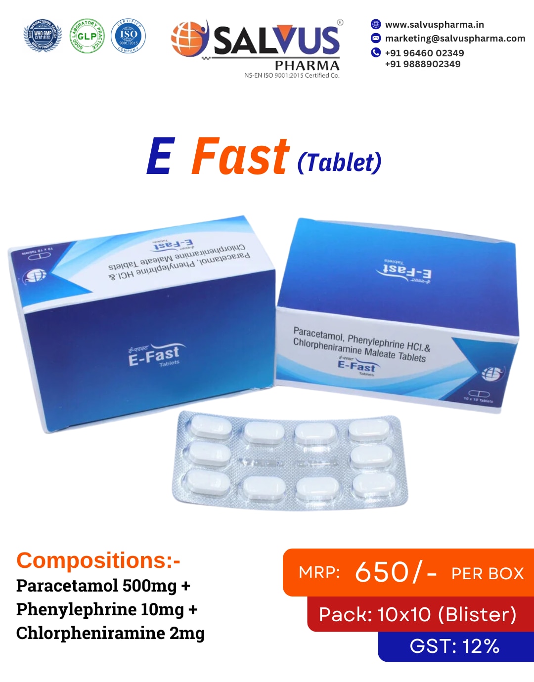 Leading Manufacturer & Supplier of Anti-Cold Tablets Salvus Pharma is a renowned manufacturer and supplier of Paracetamol, Phenylephrine HCl, and Chlorpheniramine Maleate Tablets, a trusted combination for cold and allergy relief, marketed under the brand name E Fast. As a distinguished ISO, WHO-GMP, and GLP certified pharmaceutical company, we are dedicated to providing effective and high-quality solutions for common ailments. The safety and efficacy of E Fast are assured, as it is produced in our modern manufacturing facilities that comply with the highest international quality standards. As a premier PCD Pharma company for anti-cold and anti-allergic range, we offer excellent PCD Pharma franchise opportunities throughout India. We support our franchise partners with a broad portfolio of high-demand products, exclusive monopoly rights, comprehensive marketing assistance, and a dependable supply chain. Partnering with Salvus Pharma for our popular OTC range, including the essential E Fast tablets, is a strategic step towards building a successful and profitable business. Benefits & Uses of E Fast E Fast is a comprehensive formula that combines three active ingredients to provide effective relief from the multiple symptoms of the common cold and allergies. Paracetamol (500mg): An analgesic and antipyretic that works to relieve pain such as headaches and body aches, and reduce fever. Phenylephrine Hydrochloride (10mg): A decongestant that shrinks blood vessels in the nasal passages, relieving stuffy nose and sinus congestion. Chlorpheniramine Maleate (2mg): An antihistamine that blocks the action of histamine, a substance in the body that causes allergic symptoms like runny nose, sneezing, and watery eyes. Healthcare professionals recommend E Fast for the symptomatic relief of: Common Cold & Flu Allergic Rhinitis (Hay Fever) Nasal Congestion and Sinus Pressure Fever, Headaches, and Body Aches Sneezing, Itchy, and Watery Eyes How to Use Take E Fast tablets as directed by your physician. Swallow the tablet whole with a full glass of water. It can be taken with or without food. Do not exceed the recommended dose, as it contains Paracetamol. Allow for a gap of at least 4-6 hours between doses. Side Effects While E Fast is generally safe when used as directed, some individuals may experience side effects. Common Side Effects: Drowsiness or dizziness Dry mouth, nose, or throat Nausea Headache Blurred vision Serious Side Effects (Discontinue use and contact your doctor immediately): Severe allergic reactions (rash, hives, itching, difficulty breathing, swelling of the face, lips, or tongue). Fast, pounding, or irregular heartbeat. Difficulty urinating. Nervousness or restlessness. Precautions Before you start taking E Fast, please discuss your health condition with your doctor. Allergies: Do not take this medication if you are allergic to Paracetamol, Phenylephrine, Chlorpheniramine, or any other ingredients. Driving and Operating Machinery: This medicine can cause drowsiness. Avoid driving or operating heavy machinery until you know how it affects you. Medical Conditions: Inform your doctor if you have high blood pressure, heart disease, thyroid problems, glaucoma, diabetes, or an enlarged prostate. Liver or Kidney Disease: Use with caution and under medical advice if you have liver or kidney impairment. Pregnancy & Breastfeeding: Consult with your doctor before using this product if you are pregnant or breastfeeding. Alcohol: Avoid consuming alcoholic beverages as it can increase the drowsiness effect of this medication. Drug Interactions: Inform your doctor if you are taking any other medications, especially sedatives, tranquilizers, or MAO inhibitors.